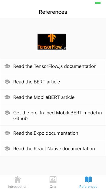 In this article, similarly to [6][7], I develop a multi-page mobile application to demonstrate how to use TensorFlow.js [5] and a pre-trained deep natural language processing model MobileBERT [8][9][10], for reading comprehension on mobile devices.