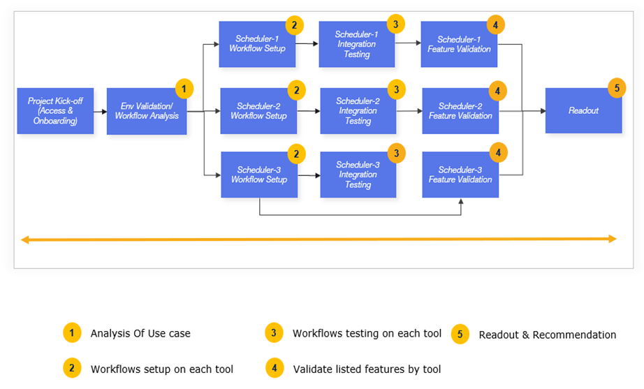 The diagram below shows the assessment flow while evaluating a PoC. As you can see, it involves multiple enterprise schedulers. Here, Scheduler-1, Scheduler-2, and Scheduler-3 refer to the enterprise scheduler tools that your organization is wanting to evaluate to make a decision.