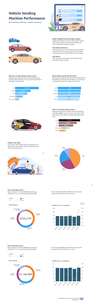 The dashboard infographic delivers key analytics to help retailers stock their VVMs to promote sales and profits. Leveraging data about the best-selling vehicle types, brands, colors, and fuel types, the dashboard offers clear direction for retailers to optimize their inventory. It also answers critical questions to help retailers maximize sales and profits for their VVMs and gain a competitive edge in the market.